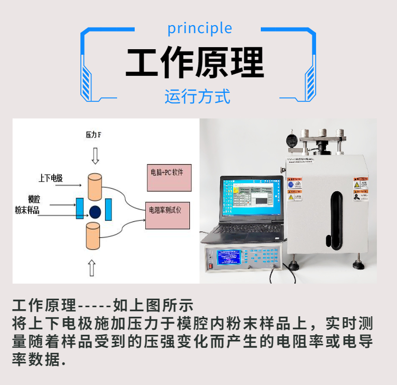 粉末電阻率測試儀的工作原理:將上下電極加壓于模腔內(nèi)粉末樣品上,實時測量隨著樣品受到的壓強(qiáng)變化而產(chǎn)生的電阻率或電導(dǎo)率數(shù)據(jù).