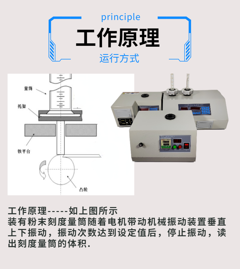裝有粉末或顆粒的刻度量筒隨著電機帶動機械振動裝置垂直上下振動,振動次數達到設定值后,停止振動,讀出刻度量筒的體積.